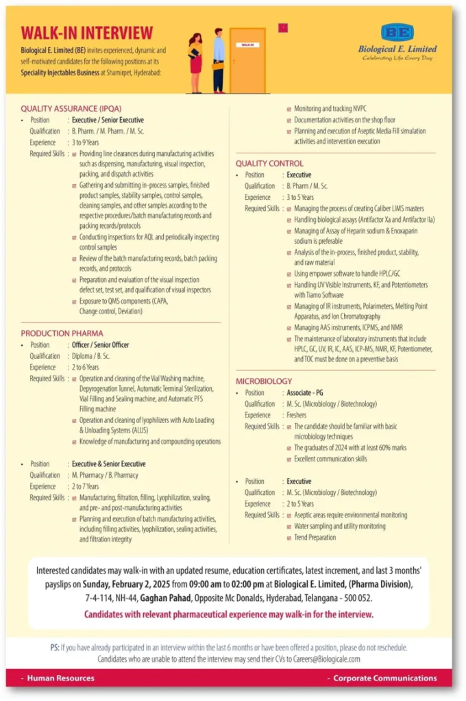 - Candidates with relevant pharmaceutical experience may walk-in for the interview.