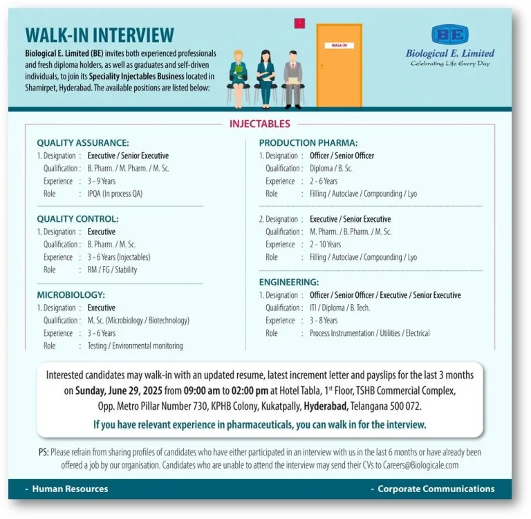Candidates who are unable to walk-in may send in their CVs by mention subject as Applying for Department Name to careers@biologicale.com.