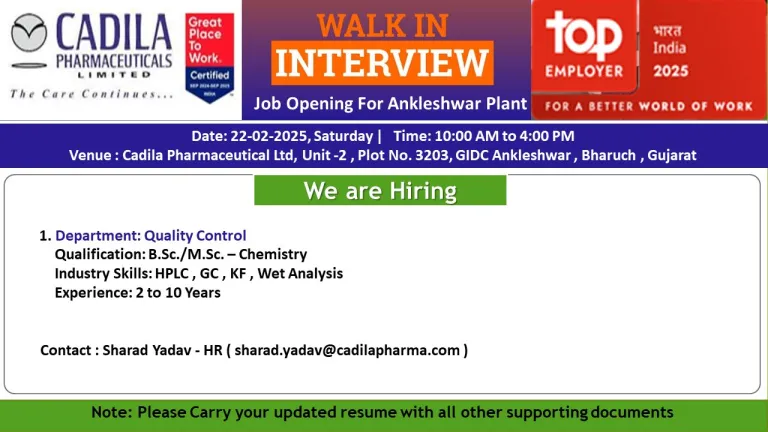 • Interview Venue : Cadila Pharmaceuticals LTD, Unit – 2 , Plot No. 3203, GIDC Ankleshwar, Bharuch, Gujarat