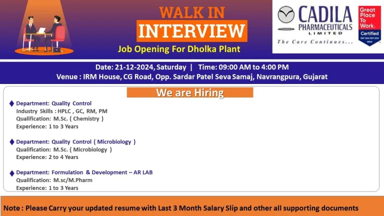 Interested Candidate Can drop your CV on ami.pawar@cadilapharma.com