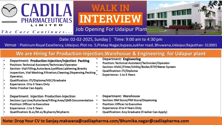 Note: Drop Your CV to Sanjay.makwana@cadilapharma.com / Bhumika.nagar@cadilapharma.com