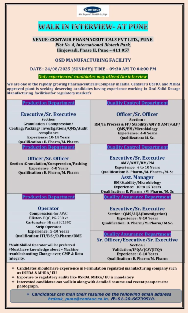 Venue: Centaur Pharmaceuticals LimitedPune,Plot No 4,International Biotech park,Hinjewadi,Phase-II,Pune