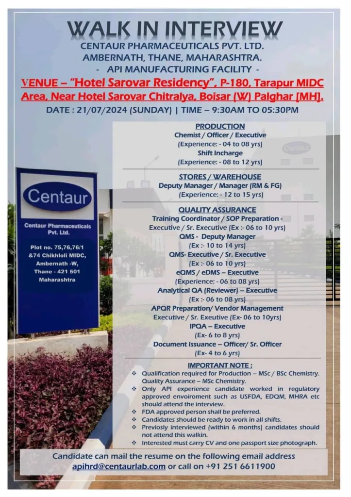 - Candidate can mail the resume on the following email address: apihrd@centaurlab.com or call on +91 251 6611900