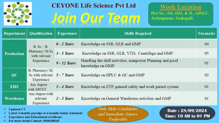 • Venue: : CEYONE Life Sciences Pvt. Ltd, Plot No: 4M, 4M1, & 4L, APSEZ. Atchnapuram, Anakapalli