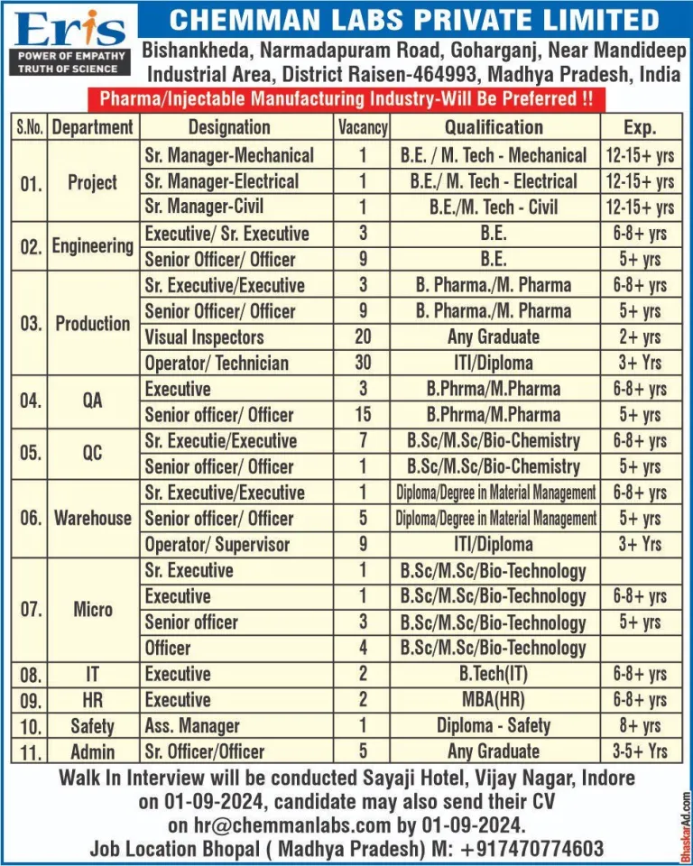 - Qualification: B.Sc / M.Sc / B.Pharm /M.Pharm / B.E / M.Tech / MBA / Any Graduate / ITI / Diploma