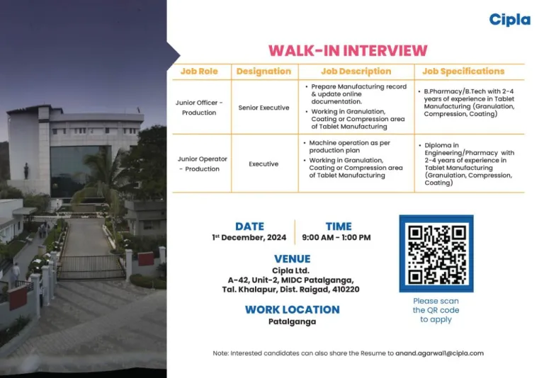- Note: Interested candidates can also share the Resume to anand.agarwall@cipla.com