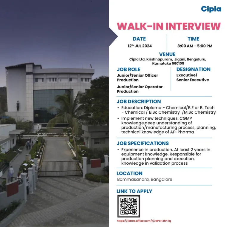 - VENUE: Cipla Ltd, Krishnapuram, Jigani, Bengaluru, Karnataka 560105