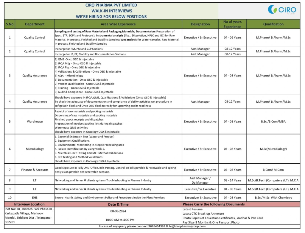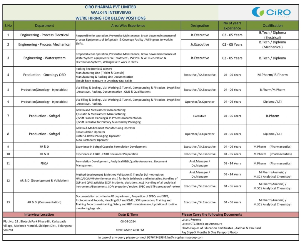 In case of any query please connect 9676434398 & hr@ciropharmagroup.com