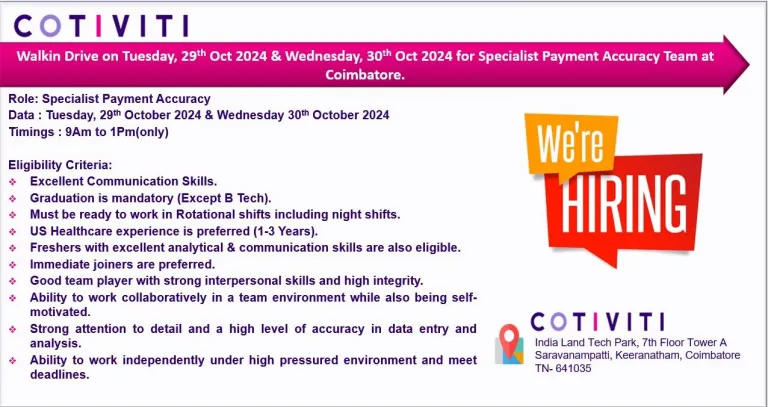 - Venue: COTIVITI INDIA PRIVATE LIMITED, 10th Floor, Galaxy, Plot No.1, Sy.No.83/1, Hyd Knowledge City, Raidurgam, Serilingampally Mandal, Hyd, Ranga Reddy, Telangana – 500081 (Landmark: Opposite IKEA
