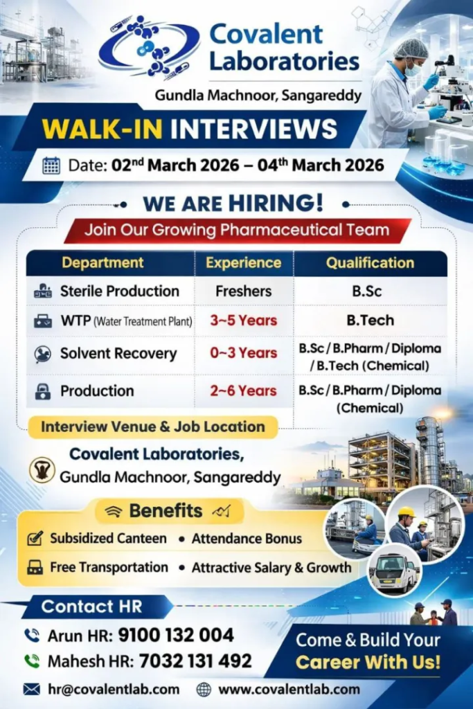 Qualification: B.Sc / B.Pharm / Diploma / B.Tech (Chemical)