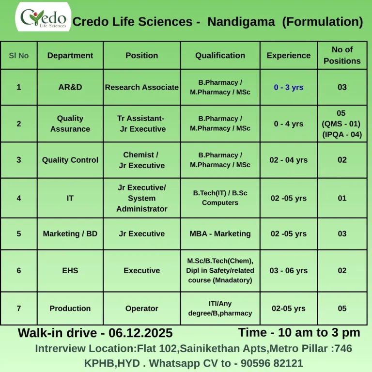 - Qualification: B.Sc, M.Sc, B.Pharm, M.Pharm, B.Tech, MBA
