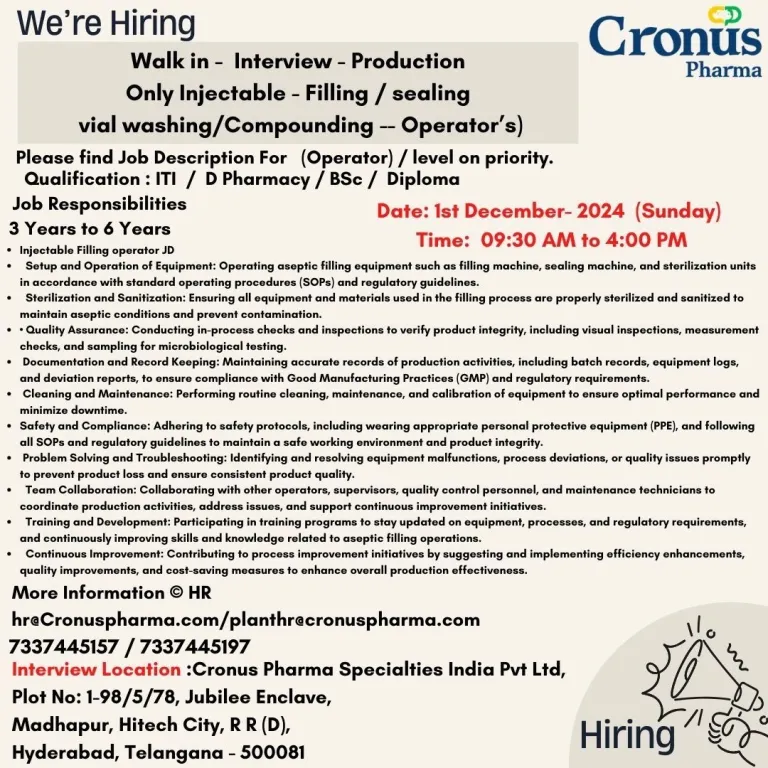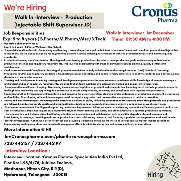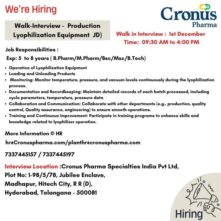 - Interview Venue:Cronus Pharma Specialties India Pvt. Ltd, Plot No: 1-98/5/78, Jubilee Enclave, Madhapur, Hitech City, R R (D), Hyderabad, Telangana – 500081