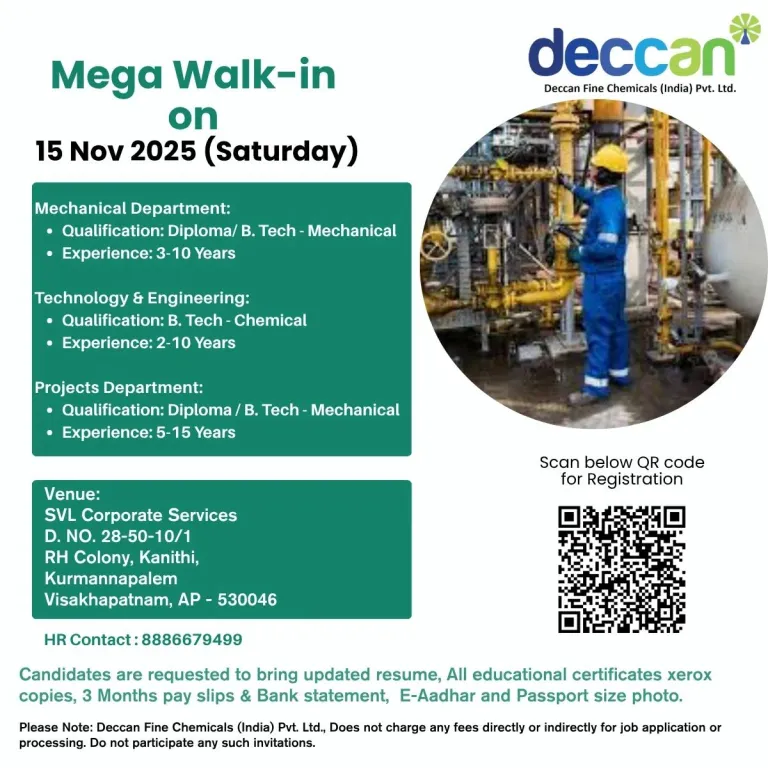 Deccan Fine Chemicals invites skilled professionals to attend our Mega Walk-in on 15th November 2025 (Saturday) for multiple openings in Mechanical, Chemical, and Project Engineering disciplines.