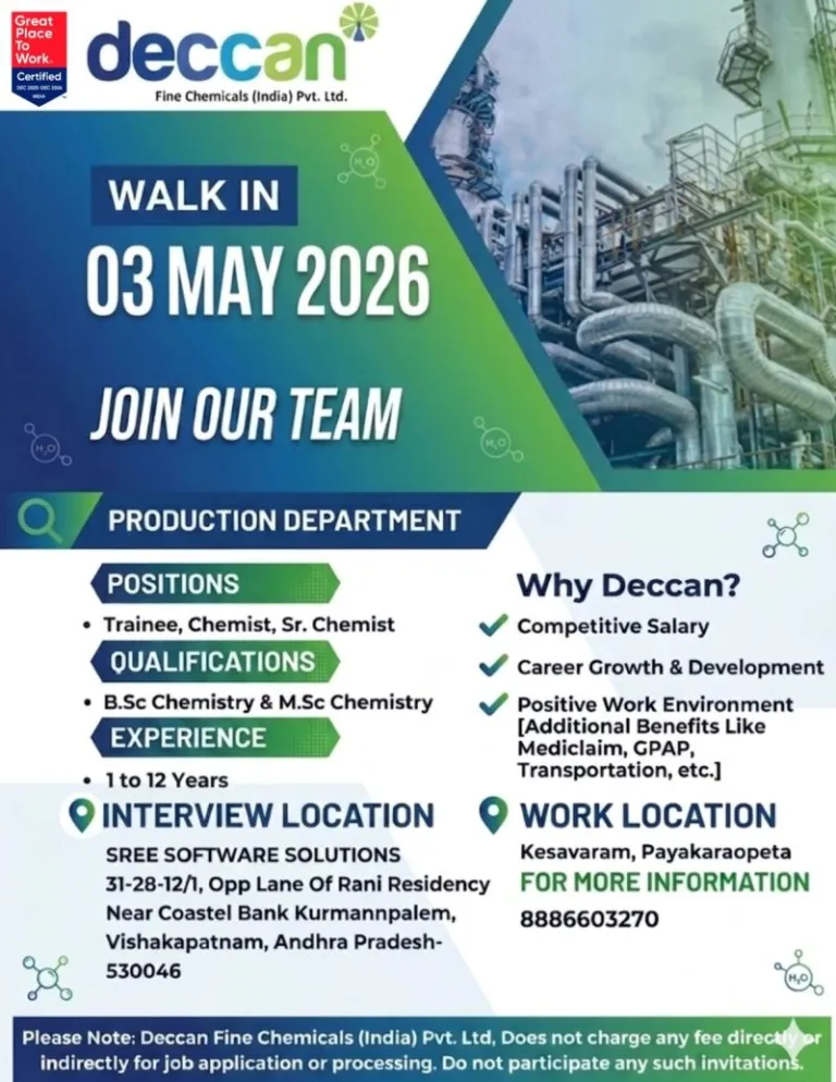 Deccan Fine Chemicals Pvt. Limited Walk-in Interview .Deccan Fine Chemicals Pvt. Limited Notification full details below.Interested and eligible candidates can attend Interview on scheduled time and venue..