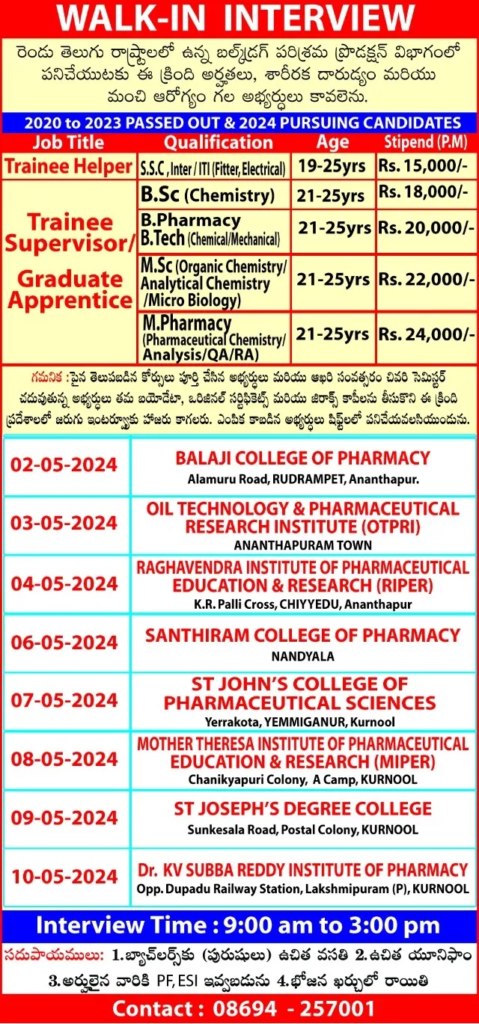 - Qualification: B.Sc / M.Sc / B.Pharm / M.Pharm / B.Tech / SSC / Inter / ITI