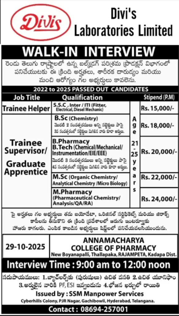 • Qualification:  B.Sc / M.Sc / B.Pharm / M.Pharm / B.Tech / ITI / Inter / SSC