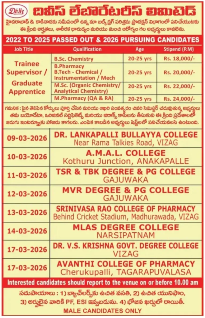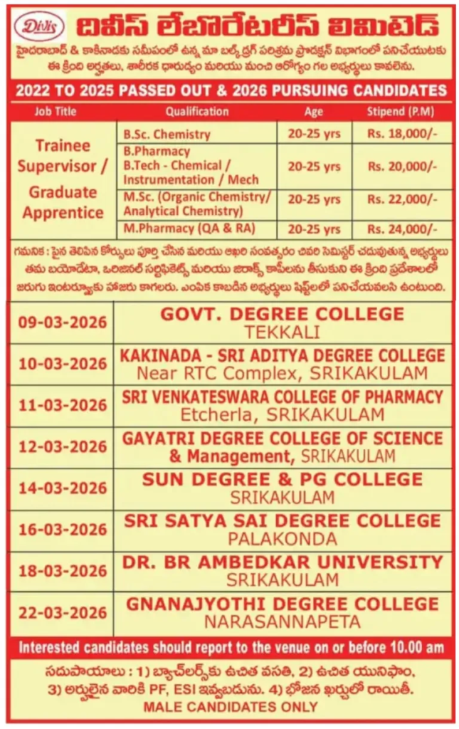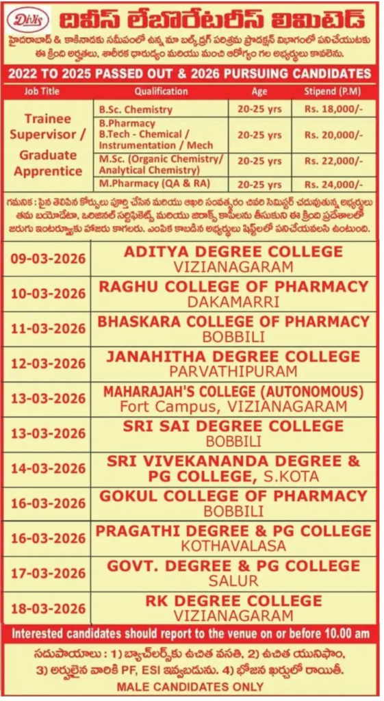 - Qualification: B.Sc / M.Sc / B.Pharm / M.Pharm / B.Tech / ITI / Inter / SSC