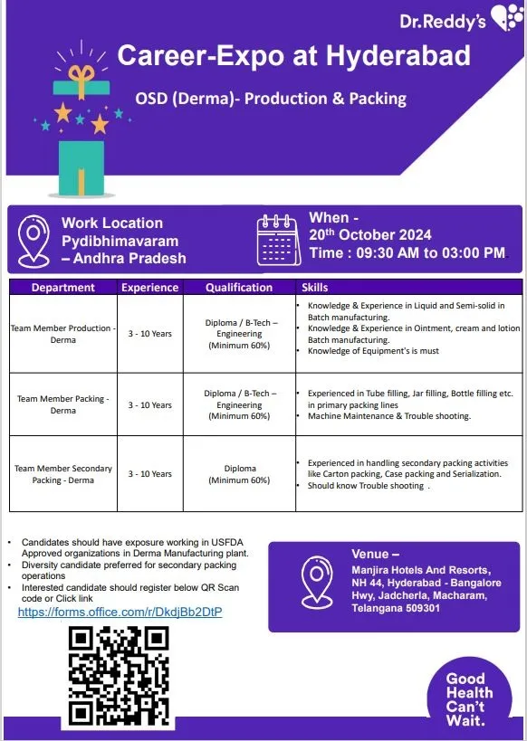 We are pleased to announce an exciting opportunity at Dr. Reddy’s Laboratories . We are actively seeking talented individuals who are passionate about the pharmaceutical industry and excel in dynamic environments. If you possess these qualities, we encourage you to explore our open positions and take the next step in your career with us. Join our team and become a part of our innovative and driven workforce.