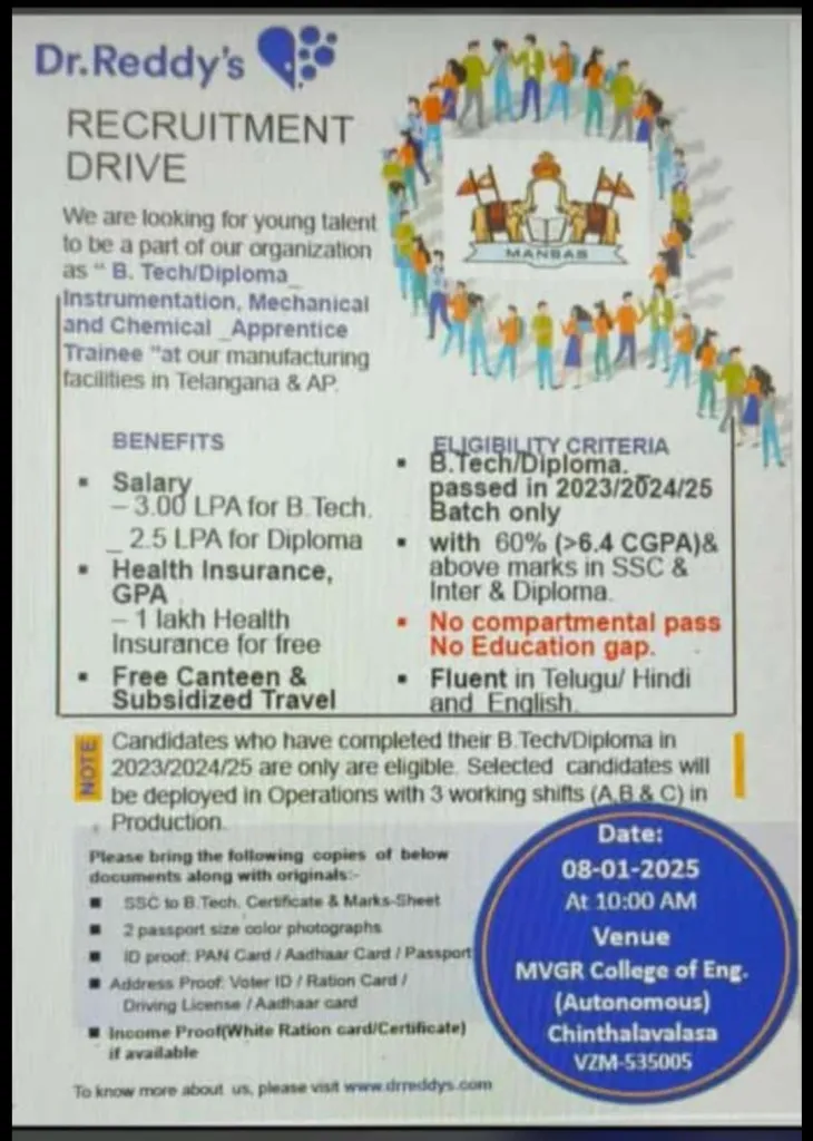 We are looking for young talent to be a part of our organization as” B. Tech/Diploma Instrumentation, Mechanical and Chemical Apprentice Trainee “at our manufacturing facilities in Telangana & AP.