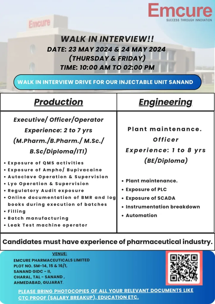 Emcure Pharmaceuticals is driven by the purpose to develop, manufacture and market a broad range of pharmaceutical products globally. So get ready to join fastest growing company leading in Pharmaceutical Industry. We believe in holistic growth and development of employees at our organization. We are hiring skilled personnel to join us in our journey of growth!