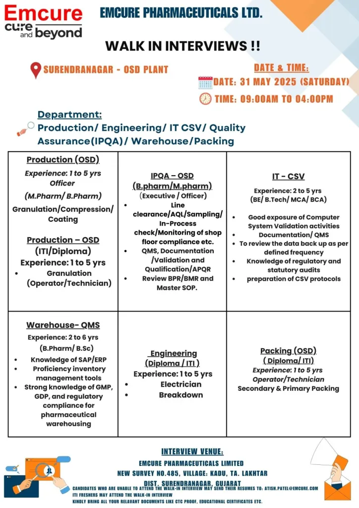 CANDIDATES WHO ARE UNABLE TO ATTEND THE WALK-IN INTERVIEW MAY SEND THEIR RESUMES TO: ATISH.PATEL@EMCURE.COM