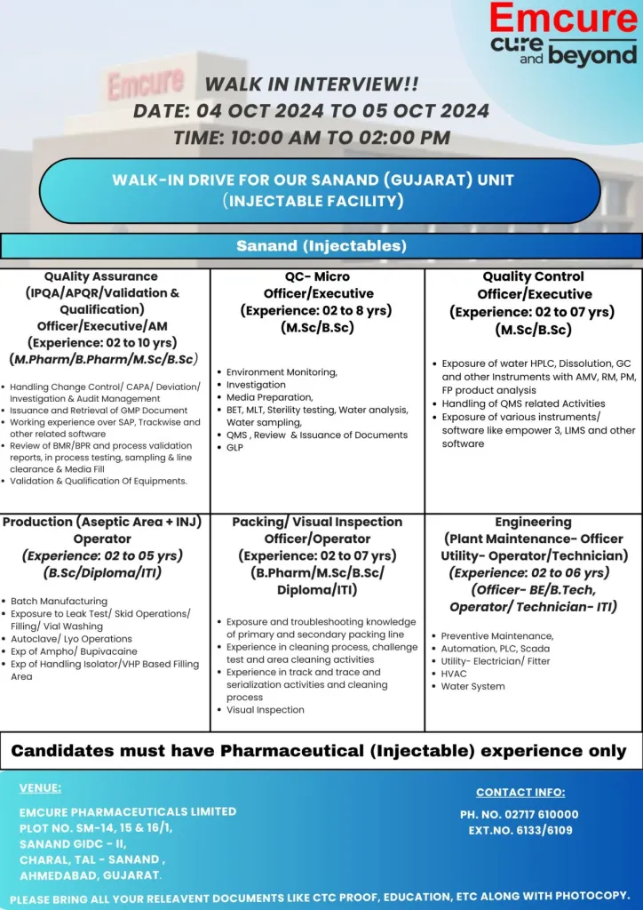 Emcure Pharmaceuticals is driven by the purpose to develop, manufacture and market a broad range of pharmaceutical products globally. So get ready to join fastest growing company leading in Pharmaceutical Industry. We believe in holistic growth and development of employees at our organization. We are hiring skilled personnel to join us in our journey of growth!