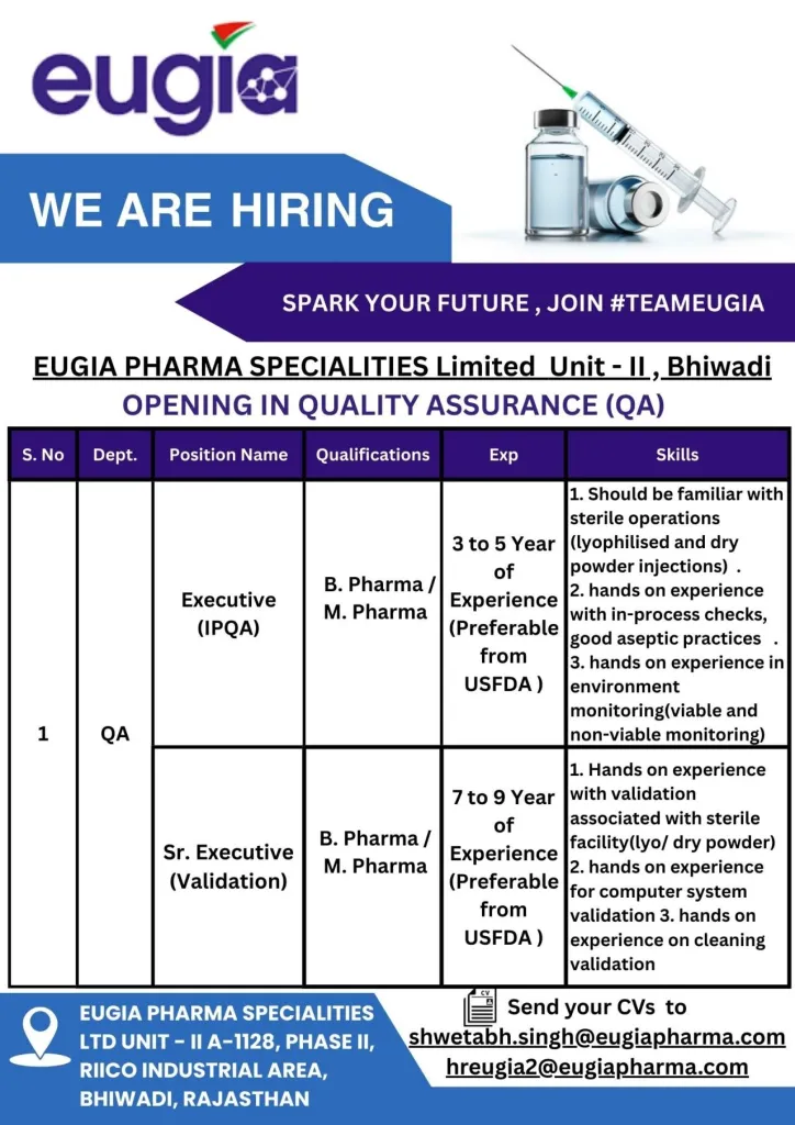 - JOB LOCATION: EUGIA PHARMA SPECIALITIES LTD UNIT – II A-1128, PHASE II, RIICO INDUSTRIAL AREA, BHIWADI, RAJASTHAN