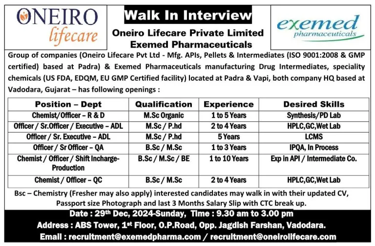 Exemed Pharmaceuticals is a young business with ambitious growth goals, We currently hold GMP certification from both the WHO and the EU. We are seeking young, enthusiastic, and ambitious professionals for the following positions in light of our planned expansion in OSDI at our Vapi facility.