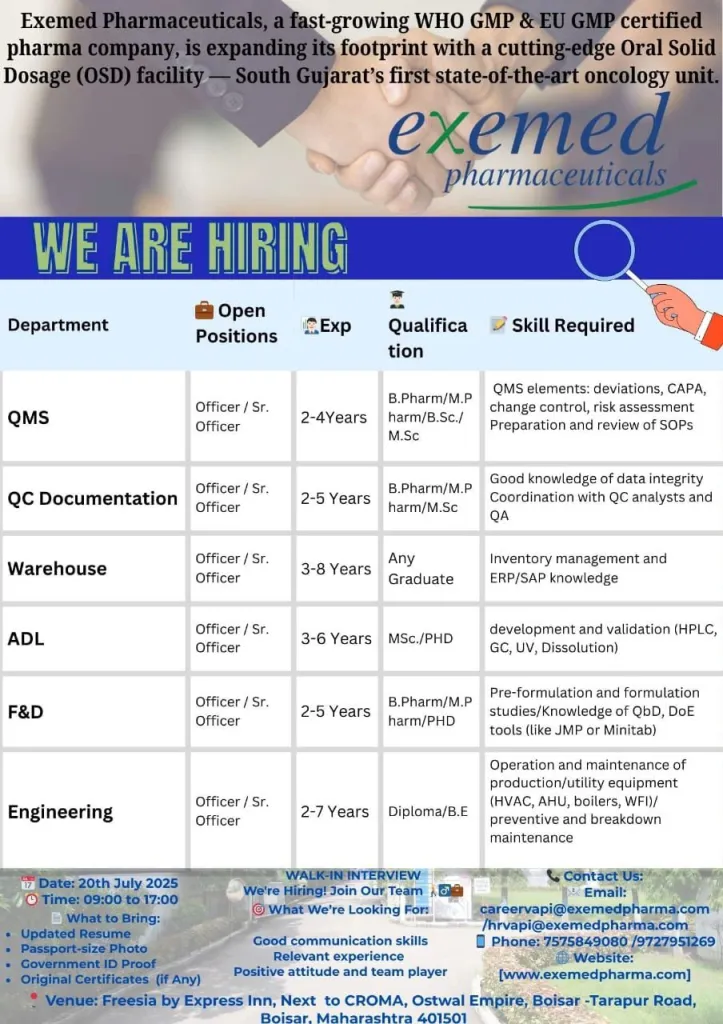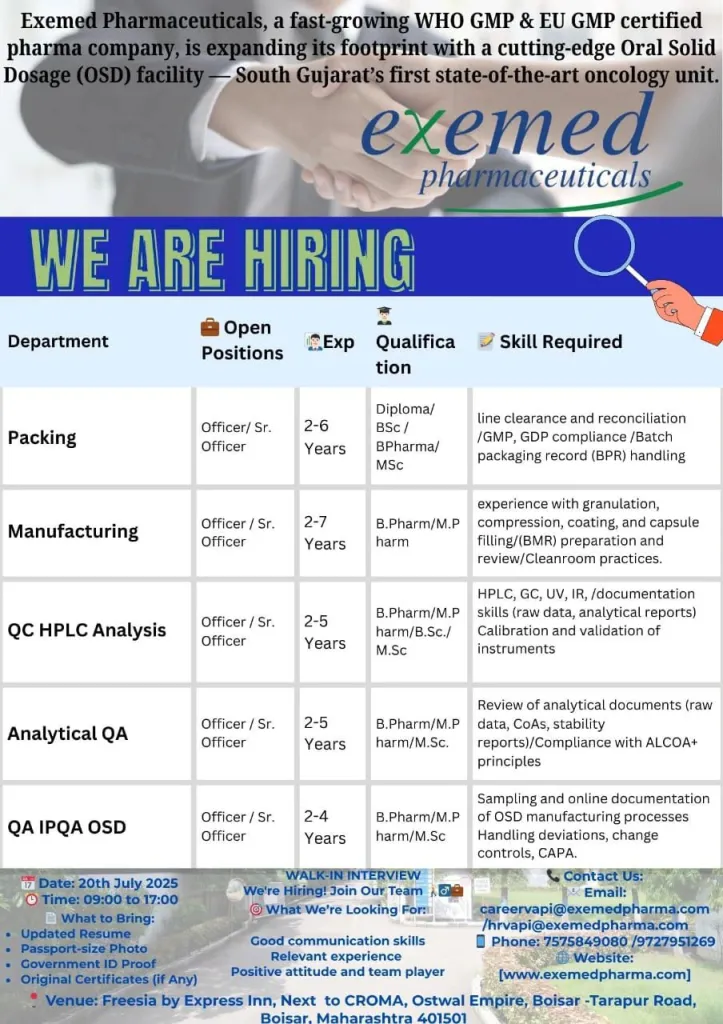 Exemed Pharmaceuticals is a young business with ambitious growth goals, We currently hold GMP certification from both the WHO and the EU. We are seeking young, enthusiastic, and ambitious professionals for the following positions in light of our planned expansion in OSDI at our Vapi facility.