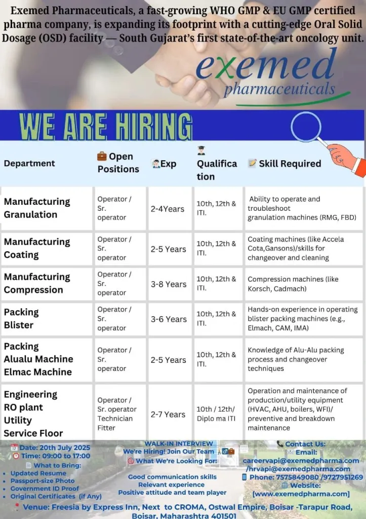 - Email: careervapi@exemedpharma.com / hrvapi@exemedpharma.com