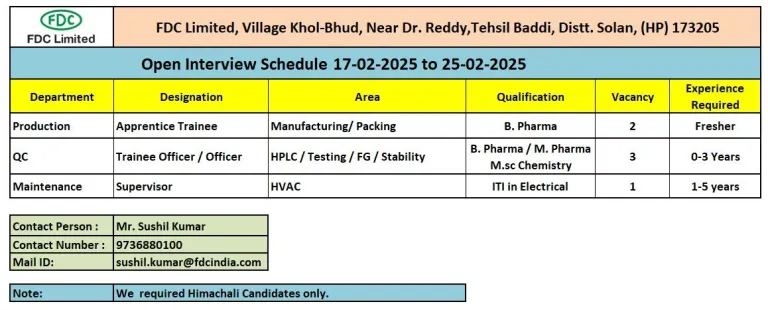 - Venue: FDC Limited, Khol-Bhud, Tehsil Baddi, Distt. Solan (HP) 173205