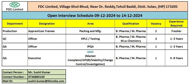- Venue: FDC Limited, Khol-Bhud, Tehsil Baddi, Distt. Solan (HP) 173205