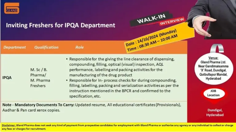 - Venue: Gland Pharma Limited, D.P.Pally, Near Gandimaisamma ‘X’ Road, Quthbullapure, Hyderabad – 500043