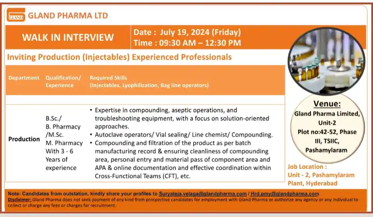 - Candidates from outstation, kindly share your profiles to Suryateja.Velaga@glandpharma.com | Hrd.pmy@glandpharma.com