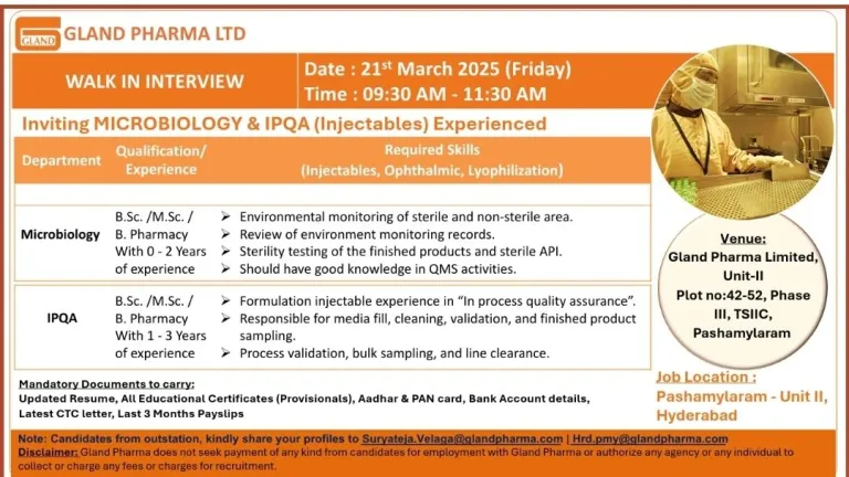 - Candidates from outstation, kindly share your profiles to Suryateja.Velaga@glandpharma.com | Hrd.pmy@glandpharma.com