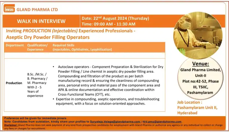 Venue – Gland Pharma Unit 2, Plot No: 42-52., Phase III, TSIIC. Pashamylaram, Patancheru, Hyderabad, Medak, Telangana, India