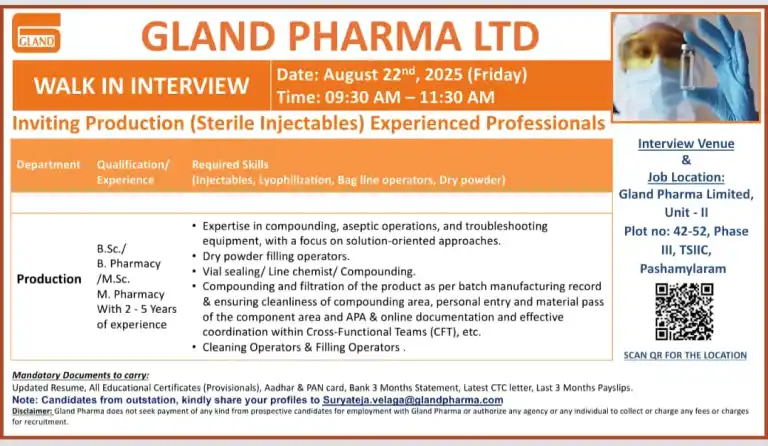 - Candidates from outstation, kindly share your profiles to Suryateja.Velaga@glandpharma.com