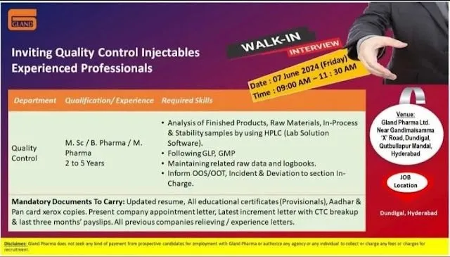 - Venue: Gland Pharma Limited SY. No: 143–148/150&151, D.P.Pally, Near Gandimaisamma ‘X’ Road, Quthbullapure, Hyderabad – 500043.
