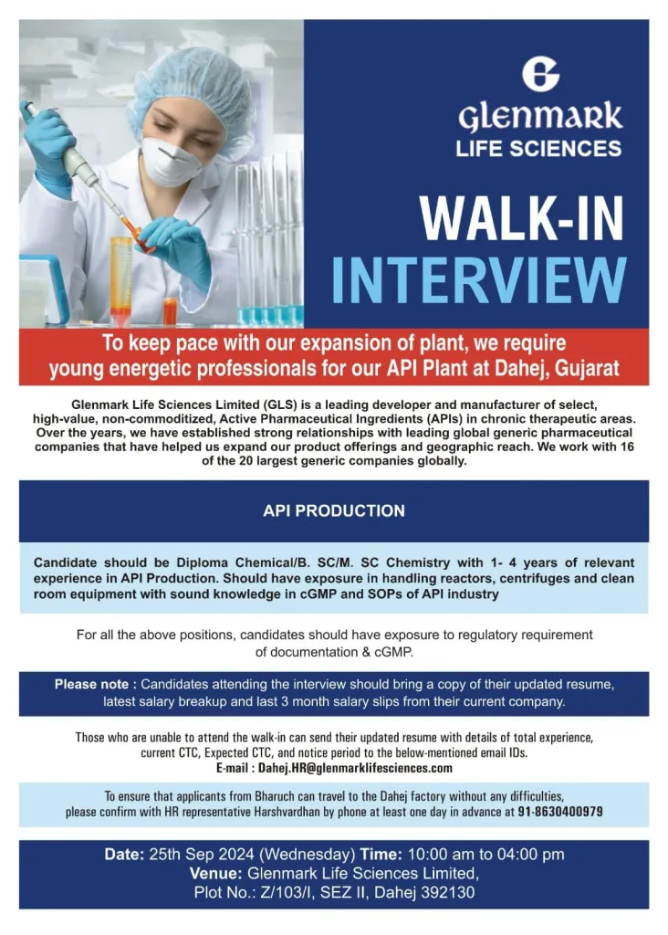 • Venue: Glenmark Life Sciences Limited, Plot No: Z/103/1, Sez-II, Dahej, Dist. – Bharuch, Gujarat.