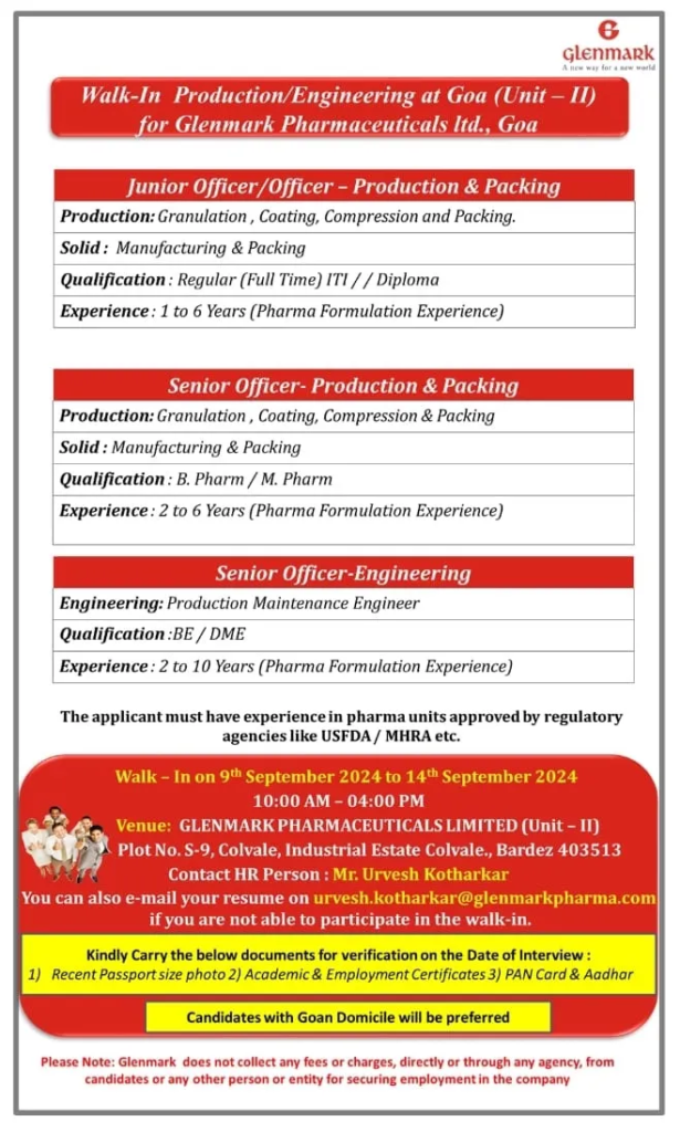 - You can also e-mail your resume on urvesh.kotharkar@glenmarkpharma.com if you are not able to participate in the walk-in.