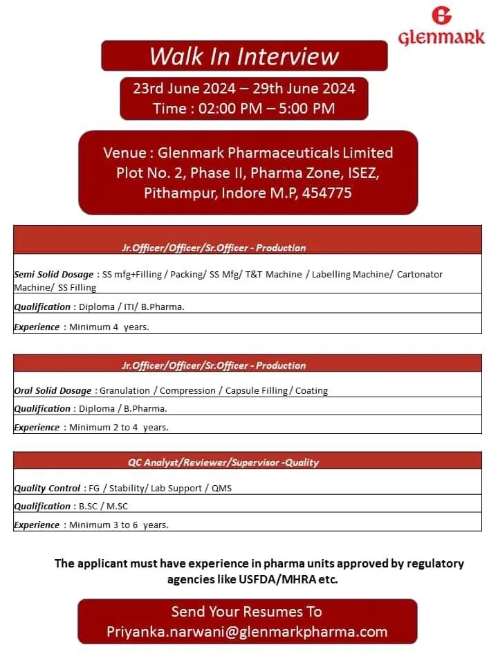 Send Your Resumes to Priyanka.narwani@glenmarkpharma.com