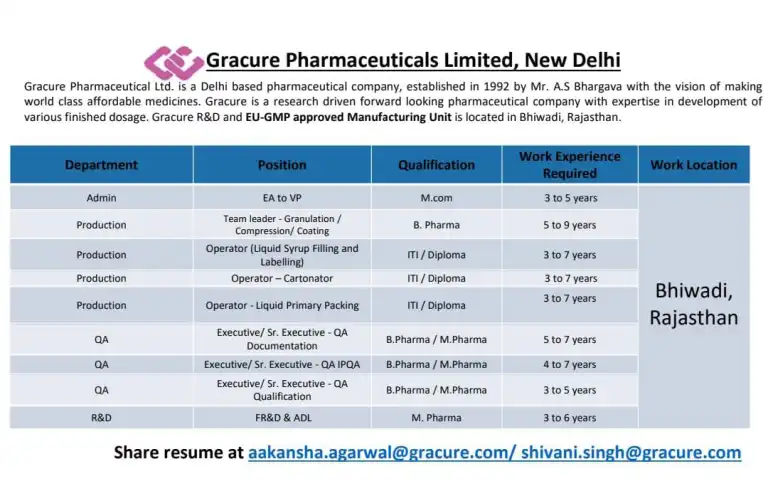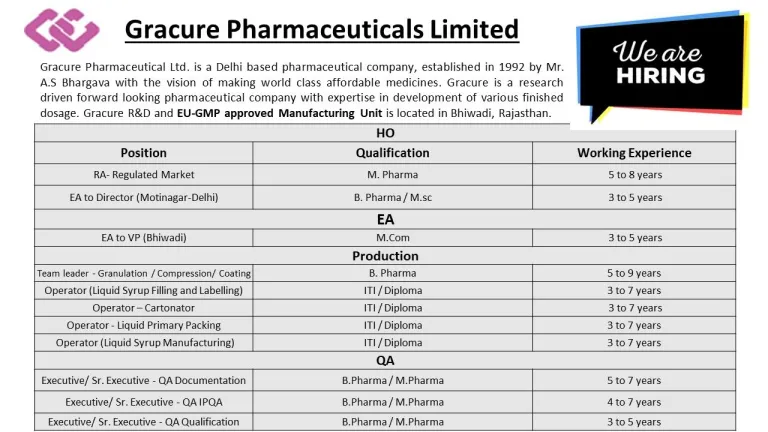 - Qualification – B. Pharma / M.Pharm / M.Sc / M.Com / ITI / Diploma
