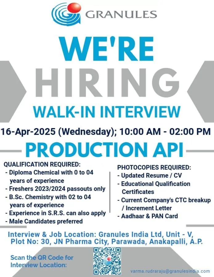 Hiring Production API Chemists for our Unit-V facility located at Parawada, Visakhapatnam, Andhra Pradesh. Interested candidates can walk-in on 16-04-2025 to our Unit-V facility.