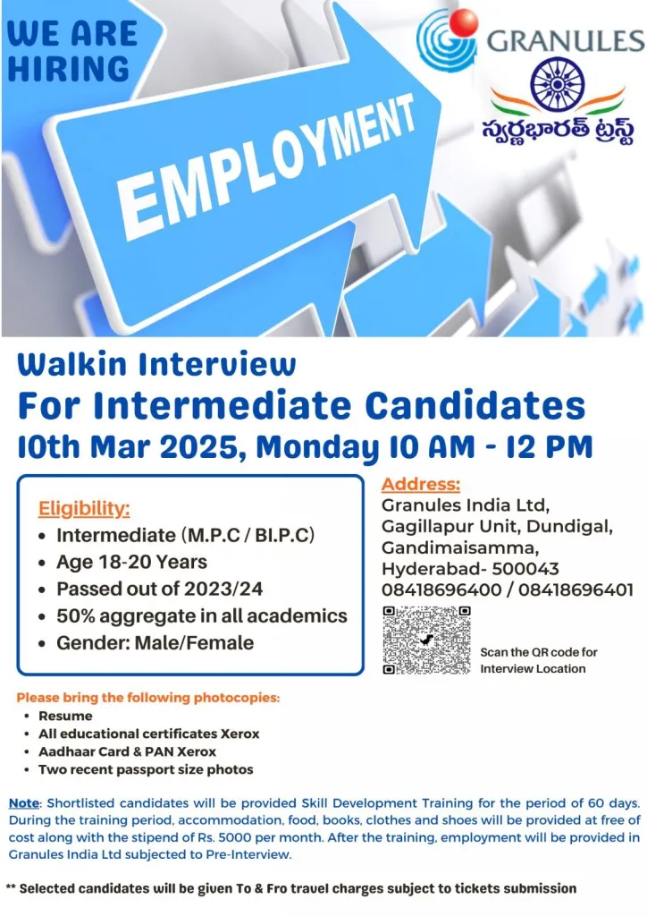 - Employment opportunity at Granules India Ltd post-training (based on interview performance)