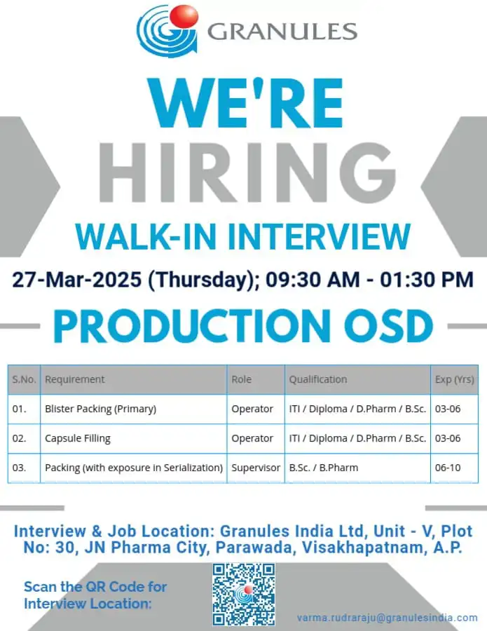 - Venue: Granules India Limited, Unit – V, Plot No: 30, JN Pharma City, Parawada, Anakapalli, A.P.