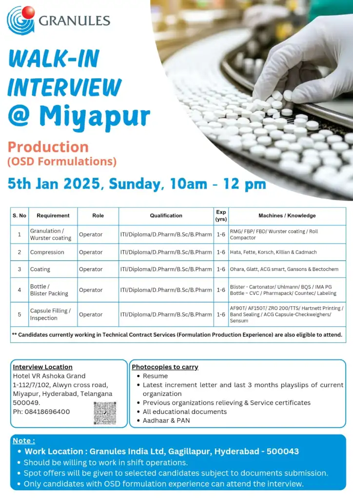- Work Location: Granules India Ltd, Gagillapur, Hyderabad – 500043