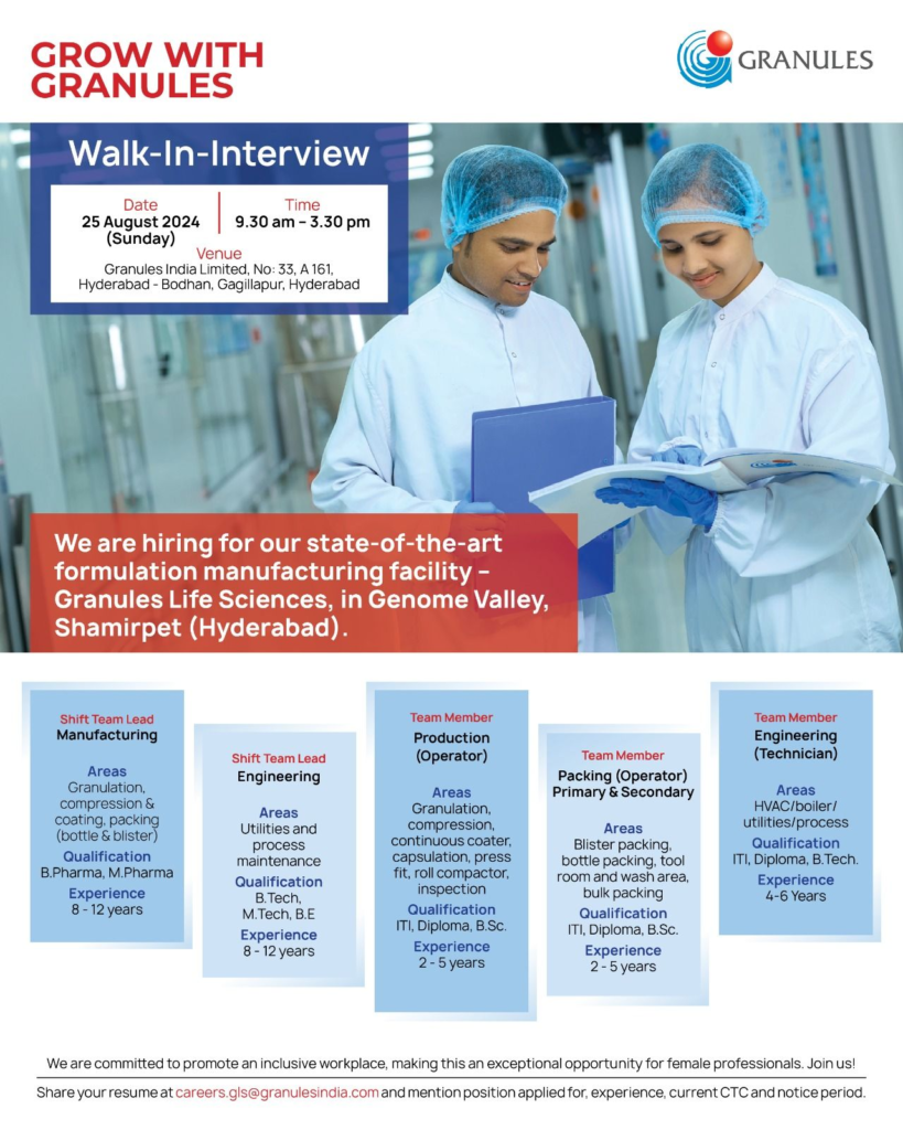 - Share your resume at careers.gls@granulesindia.com and mention position applied for, experience, current CTC and notice period.