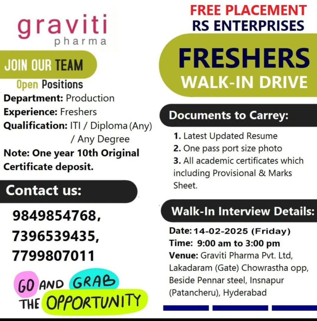 Graviti Pharma (Formulation FDA plant) Hiring For Experienced Multiple Positions Capsule filling, Compression , Granulation, Coating and Packing Apply now Through RS Pharma Enterprises(Pharma Placement). Graviti Pharma is a group concern of Yashoda Healthcare Services, which was established in 1989, currently employing over 6,600 employees and delivering excellence in healthcare. Building on the group’s reputation in healthcare, Graviti has been established to manufacture superior generics for consumers worldwide.