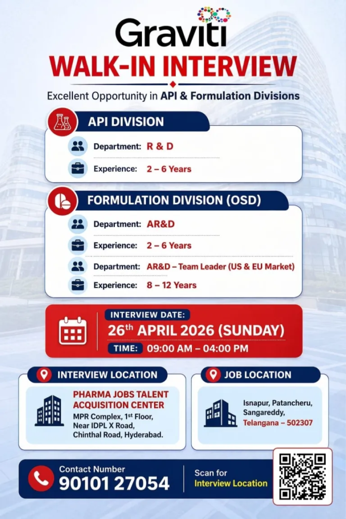Venue: PHARMA JOBS TALENT ACQUISITION CENTER, BHAGYARATHI DEGREE COLLEGE 1ST FLOOR, NEAR IDPL X ROAD, CHINTHAL ROAD, HYDERABAD