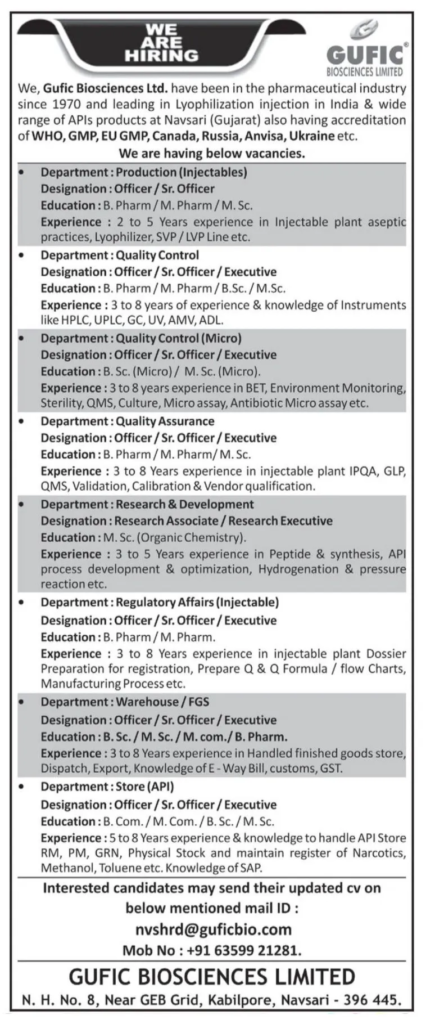 - Education: B. Pharm/M. Pharm/B.Sc./M.Sc.